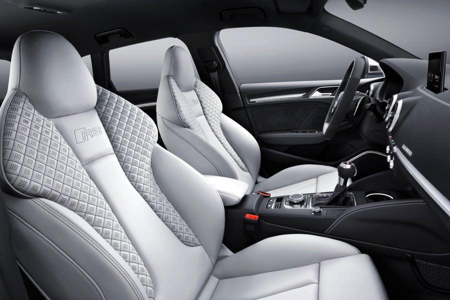 LED-Scheinwerfer mit markanter Licht-Signatur sind serienmäßig, auf Wunsch liefert Audi Scheinwerfer mit Matrix LED-Technologie. Am Heck sorgen ein markanter RS-Dachkantenspoiler, ein Diffusoreinsatz und die großen ovalen Endrohre der RS-Abgasanlage für Aufsehen. Ein quattro-Schriftzug im unteren Bereich des Singleframes komplettiert den dynamischen Auftritt, ebenso wie ein RS 3-Emblem am Wabengitter und an der Heckklappe.