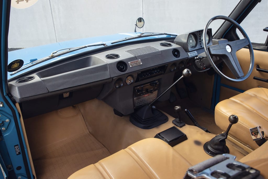 Vorwitzig ragt der Stummel des Handbremshebels aus dem Teppich-Gewebe, dessen Sisal-Struktur nebst grüner Einfassung einen speziellen Charme versprüht. „Die Original-Range-Rover-Lacke der damaligen Zeit gefielen mir nicht“, erinnert sich Alexander van den Ven, „das so genannte Oak-Green passt viel besser zu dem Auto.“
