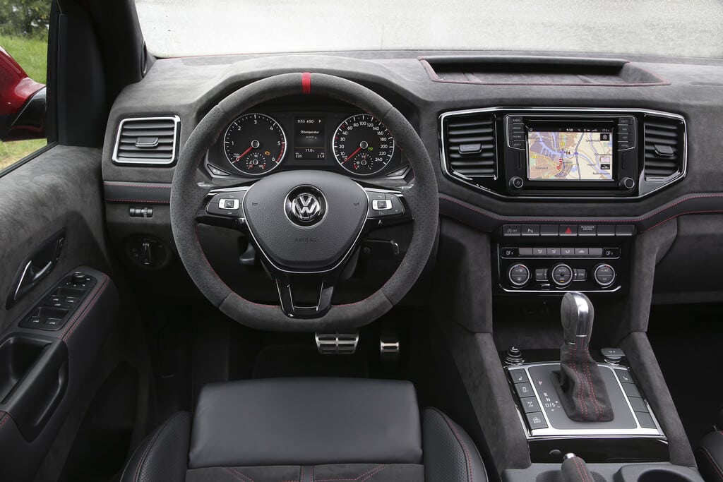 Mit relativ geringem Aufwand ist es der Firma 7-Lights gelungen, LED-Rückleuchten und vordere Blinker einzubauen; wegen des identischen Leuchtbildes war dafür keine Neuabnahme erforderlich. Und schließlich haben sich die Erschaffer des Red Amarok auch das Interieur vorgenommen: Zunächst wurden Dachhimmel und -säulen im Werk mit Alcantara verkleidet, anschließend ging die Halstenbeker Sattlerei Neidfaktor an die Arbeit. Dort wurden Armaturenbrett, Mittelkonsole und zahlreiche Bedienelementen mit Alcantara verkleidet.